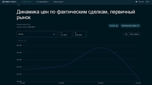 Не так страшен чёрт, как его... картинка. Картинка по Москве, конечно, впечатляющая. Такой прям спуск со свистом в апреле. По России плавный рост. Если переходить к цифрам по цене метра в сделках в системе Сбер, всё гораздо скромнее. Зато, натурально. По Москве цены: В апреле - 349 763 В марте - 354 966 Ну уж и до кучи в январе - 351 509 То есть снизились не только к прошлому месяцу, но и к началу года...