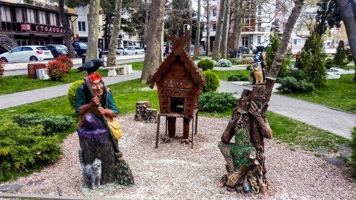 Всем привет. Я уже писал в одной из своих статей, что Геленджик отлично подходит для отдыха с детьми. Там и пляжи песчаные, и у берега неглубоко, и много аттракционов. И еще, гуляя по набережной мы наткнулись на один парк, в котором живут различные сказочные персонажи и герои любимых мультиков. Не верите? Смотрите сами. Вот, например, Баба Яга, избушка на курьих ножках и сказочный Говорящий Пень. На голове у Яги сидит черный ворон, а внизу об ступу трется кот. Только кот почему-то серый, по идее он черным должен быть, вроде...
