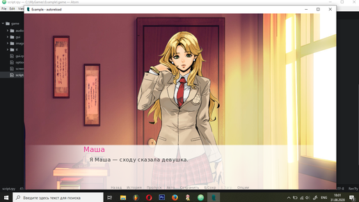 Итак. Фон у нас уже есть и мы можем теперь добавить в игру персонажа. Картинки с персонажами должны иметь формат png или bmp и иметь прозрачный фон. Давайте сделаем это. Отлично! Теперь мы видим, с кем мы говорим. Как это сделать? Как видите, я написал следующее: show norm_girl: xalign 0.5 yalign 1.0 with Dissolve(0.2) pause .1 Из прошлой главы вы уже знаете что такое xalign и yalign. Но у нас появилось новое значение. Со слова with начинаются различного рода переходы. В данном случае, это плавное появление...