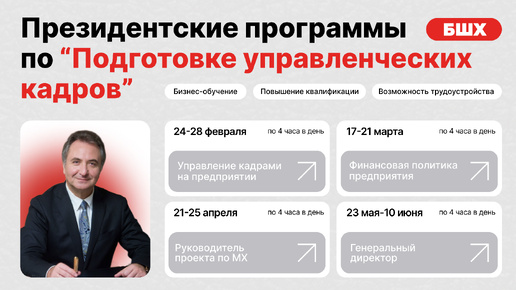 В рамках президентской программы по «Подготовке управленческих кадров» в области дополнительного образования и повышения квалификации, Бизнес-Школа проводит обучения по следующим направлениям: Учебная нагрузка составляет всего 4 часа в день, что позволит легко сочетать обучение с вашей основной деятельностью...