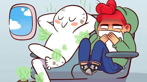 Нет, конечно, кошмар, когда ты садишься в самолет и понимаешь, что лететь придется с семьей из Тагила с маленькими капризными карапузами. Или если волосы соседа блестят салом ярче, чем само сало. И ест он что-то сальное. Каждый из нас сталкивался с подобным в поездке. Потом это вспоминается со смехом, но во время путешествия не до хи-хи, ха-ха, просто думаешь: скорей бы приехать/прилететь. Молодая художница с ярко-рыжими волосами всё разложила по полочкам в смешном комиксе и показала, какие бывают типы ужасных попутчиков...