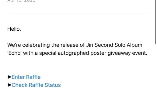 🩵🩵🩵🩵 Розыгрыш постера с автографом в честь выхода второго сольного альбома Джина “Echo” Здравствуйте! В честь выхода второго сольного альбома Джина “Echo” мы проводим специальный розыгрыш постера с автографом. ▶ Участвовать в розыгрыше ▶ Проверить статус участия ▶ Купить альбом Информация о призе • 1 постер с автографом Кто может участвовать • Все, кто купит хотя бы одну копию альбома [RAFFLE EVENT] ‘Echo’ на Weverse Shop (Global) в течение периода проведения мероприятия и заполнит заявку на участие...