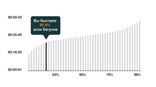 Вы наверняка слышали или читали о масштабном исследовании портала runrepeat.com. Я хочу обратить внимание на калькулятор, который они разработали на основании этих данных (35 млн результатов соревнований за 20 лет). Он позволяет сравнить свой результат с результатами других бегунов и понять, сколько процентов бегают быстрее или медленнее вас. Все просто: вводим возраст, пол, выбираем соревнование (доступны 5 км, 10 км, полумарафон и марафон), указываем время. После этого вы получите график и значение в процентах и узнаете, например, что вы лучше 92% бегунов мира на полумарафоне...