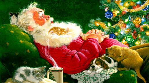 Перед вами - 10 иллюстраций американского художника Тома Ньюсома (р. 1944). На каждой - Санта-Клаус и котики (чаще - котята). Попробуйте обнаружить всех котиков. Под каждой картинкой мы укажем, сколько котиков разглядели на ней мы...