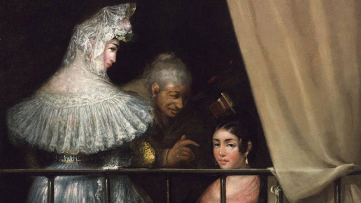 Художник-романтик Леонардо Аленса-и-Ньето (1807–1845) считается одним из самых талантливых последователей Франсиско Гойи (1746–1828). В этой работе трагически недолго проживший художник воссоздал любимый сюжет своего кумира: мах, то есть молодых девушек в роскошных нарядах, смотрящих с балкона на улицу. В XIX веке это было разговорное название молодых жительниц окраин Мадрида. Пожилая женщина позади них — Селестина, знакомый персонаж из классической испанской литературы...