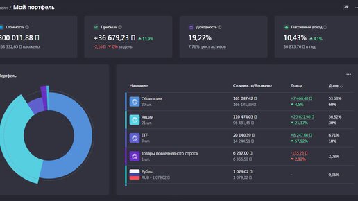 Я искал себе сервис по прогнозированию и анализу портфеля в более удобном формате, чем в брокерских приложениях. По данным приложения брокера я заработал бумажной прибыли всего 6% за полтора года или же 17 тысяч рублей Это всё связано с тем, что брокер не учитывает начисление купонов, прибыль от продажи активов, а ориентируется только на рост цены активов. Что есть в Snowball Income? Прежде всего очень удобный и информативный интерфейс на главной странице, где можно настроить доли портфеля в соответствии со своей стратегией...