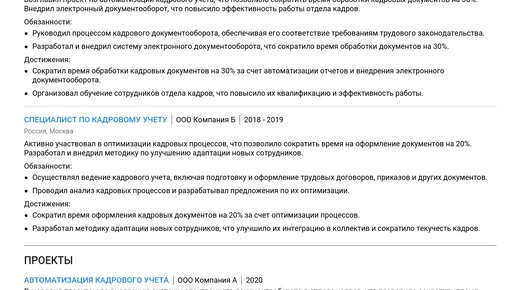 Пример резюме ведущего специалиста по кадровому учету 2025