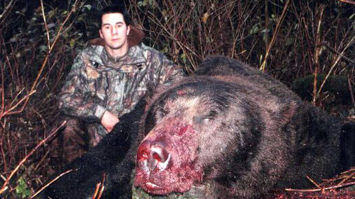 Гигантский медведь людоед. Произошел данный инцидент в США штат "Аляска". Осенью 2009 года, во время охоты на оленя, молодой человек буквально в 50-и метрах от себя увидел огромный силуэт который начал двигаться в его направлении. Парень успел среагировать и выпустил в цель целый комплект боеприпасов из семи миллиметровой полу-автоматической винтовки. Медведь рухнул всего каких то паре шагов от охотника, но продолжал дышать и шевелиться. Сменив пустой магазин на снаряженный, были сделаны контрольные выстрелы...