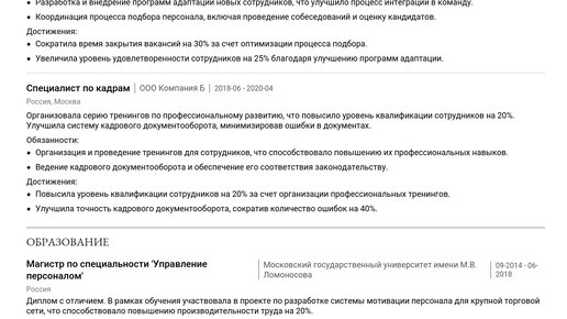 Пример резюме старшего специалиста по кадрам 2025 - Готовые примеры