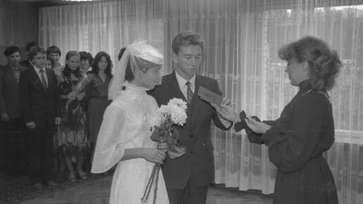 Сегодня я предлагаю читателям вспомнить, как проходили свадьбы в 80-х годах. Я нашла интересную серию фотографий со свадьбы молодой пары из Зеленограда. Пара с гостями и свидетелями прибыла в ЗАГС. На невесте длинное платье А-образного силуэта с широкими рукавами и воротничком стойкой. Вместо фаты - элегантная шляпка-таблетка с вуалью. Свидетели ставят подписи. Регистратор с указкой подсказывает, где нужно расписаться. Молодожены уже надели кольца. И получают свидетельство о браке. Вот нравится мне, что раньше свидетельство было в жестких корочках, очень удобно...