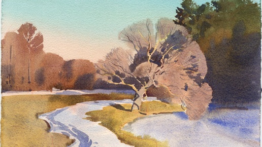 20250121 Замёрзший пруд / Ice on the pond / 21x30 см. И натурный набросок. Конструирование пейзажа. Constructing an imaginary landscape. Краски Pinax Extra. Бумага 100% хлопок Палаццо 300 гр. Акварельные упражнения по вторникам (Москва, Садово-Кудринская 25) "Арт галерея Москва"...
