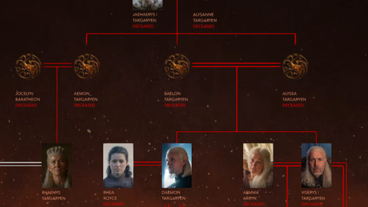 Повествование сериала начинается со старого короля Джейхериса I. В первых сериях он созывает совет, чтобы назначить наследника, так сыновья его умерли.... Предки Джейхериса I выше по семейному дереву. Отца Джейхериса I звали Эйнис I, деда Эйгон I (Завоеватель) он женился на своих обеих сестрах. Еще известно о прапрадеде Джейхериса I, звали его Эрион. Братья и сестры Джейхериса I. У Эйниса I было 6 детей, но важны те, что имели потомство. Все браки были заключены внутри семьи между братьями и сестрами...