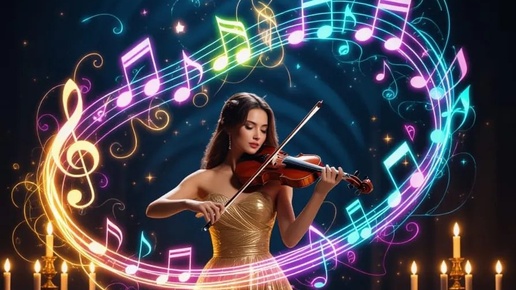 Realistic photo artwork featuring a female figure playing a violin. She stands in a dimly lit, mystical setting, surrounded by glowing, colorful swirling musical notes and wisps of light that create a magical atmosphere. The background is dark, with a series of ornate candelabras casting a warm, golden glow. The woman's dress is flowing and appears to be made of gold shimmering, translucent fabric that blends with the surrounding light...