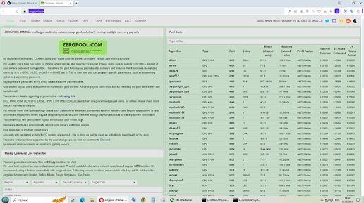 Zergpool при соответствующих настройках позволяет одновременно на разных фермах генерировать разные крипто-монеты, а выводить в единой, указанной вами крипто-валюте. (Например в BTC, LTC. DGB, DASH и так далее) Список возможных к генерации монет видим на главной странице пула https://zergpool.com Теперь сразу об основах управления пулом и его настройками . Сначала выбираем алгоритм, на котором желаем производить майнинг в правой колонке пула. Щелкаем мышкой по желаемому алгоритму, например вот так Выбрав желаемый к майнингу алгоритм щелкаем мышкой вот здесь Нам нужен именно раздел Mainers ...