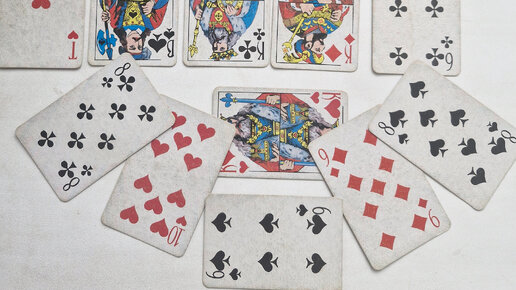 Девятка пик- сборы в дорогу, потеря друга; при пиковом короле, даме-любовь; при другом короле- нескромные желание по отношению к даме; девятка пик острием вверх- ссора, слезы. С тузом пик- серьезная болезнь, опасность для жизни; С тузом треф- польза или вред (смотря по ближайшей светлой или темной карте); С тузом червей- близость мужчины, женщины, радостная встреча с другом; С тузом бубен- хитрость и обман близких; С десяткой пик- неожиданное получение денег. Восьмерка еик- неудача, печаль, разговор, болезнь; комната, квартира солидной особы...
