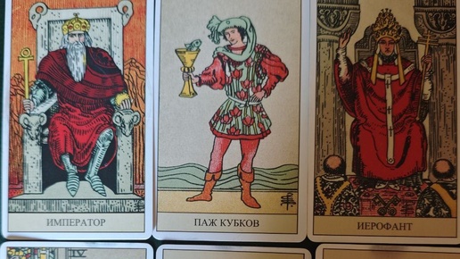 Карты, которые легли на стол: Император, Паж Кубков, Иерофант, 4 Мечей, Паж Жезлов, Король Пентаклей.