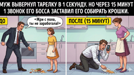 «Жри с пола, ты не заработала!» — муж вывернул тарелку в 1 секунду. Но через 15 минут 1 звонок его босса заставил его собирать крошки