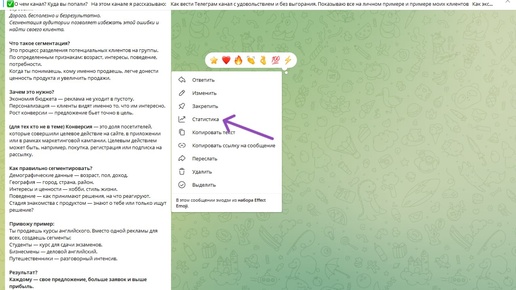 🔮 Не гадай, а анализируй! Как статистика Telegram поможет вырастить канал Зачем гадать, какой контент “зайдет”? Анализ статистики Teлеграм - твой лучший друг! Именно он покажет, что нравится подписчикам, а что - в топку. Мой опыт: Как анализ статистики помог мне взбодрить Teлеграм канал Канал то есть, а толку мало: охваты и вовлеченность никакая. Начал анализировать статистику по постам. Оказалось, длинные посты мало читают, а вот короткие с чёткими фактами залетают на ура! Поменял стратегию - и канал начал шевелиться и стал активнее...