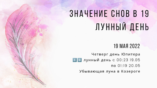 19 мая 2022 Четверг день Юпитера 1️⃣9️⃣ лунный день c 00:23 19.05 по 01:19 20.05 Убывающая луна в Козероге 19 лунные сутки – денёк тёмный для всех, кому за неуплату отключили надежду. Сложный день, и сны тоже могут быть неприятные, поэтому при анализе можно сразу делить их на два. Поэтому если тебе приснился плохой сон, прочитай после сна какую-либо молитву, например "Отче Наш" или скажи "Куда ночь туда и сон", и представь, как сон рассеивается. В этот день лучше...