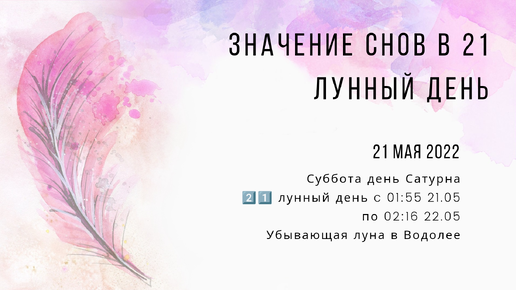 21 мая 2022 Суббота день Сатурна 2️⃣1️⃣ лунный день c 01:55 21.05 по 02:16 22.05 Убывающая луна в Водолее На 21 лунные сутки у тебя могут побаливать ребра, ведь твоё огромное сердце снова будет с разбегу биться о них изнутри. Очередной добрый день на убывающей Луне важно потратить на любовь и высокие планы. Главная задача снов в эти сутки показать насколько проявляется в жизни твоя творческая энергия, подавлена ли она совсем или мало выражена...