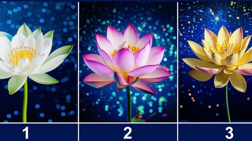 Здравствуйте, друзья! Лотос — символ чистоты, мудрости и духовного пробуждения. Во многих культурах этот прекрасный цветок олицетворяет стремление к высшему, и люди верят, что он может помочь предсказать будущее. Взгляните на картинку и выберите один из трех лотосов. Доверьтесь своей интуиции, чтобы узнать, что ваш выбор говорит о будущем вашего желания. Белый лотос №1 Вы выбрали белый лотос. Этот цветок символизирует чистоту, духовное просветление и новые начала. Ваше желание сбудется, но этот процесс займет некоторое время...