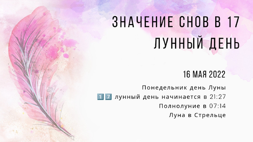 16 мая 2022 Понедельник день Луны 17-й лунный день начинается в 21:27 Полнолуние в 07:14 Луна в Стрельце Сны, которые придут к нам в этот день, захочется взять в рамку и повесить на стену. Как известно, эти лунные сутки связаны с активностью женской энергии, в том числе с ее сексуальной частью. И как следствие, сны являются отражением того, насколько у тебя гармонично идет реализация сексуальной энергии. Сон может показать насколько она подавлена, и какова степень не реализации сексуальных желаний и фантазий...