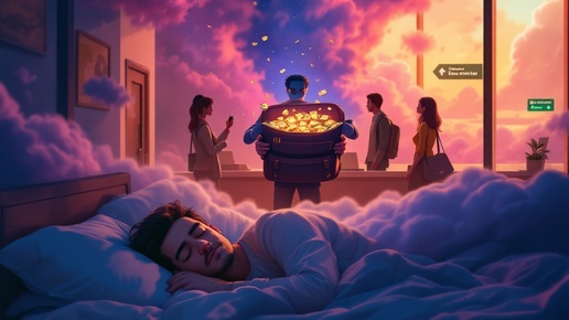 Приснилось, что я покупаю путёвку на Кипр и получаю сдачу в виде крупных пачек денег. Затем еду в аэропорт и пытаюсь найти свой рейс. Кто-то подсказывает, куда пройти в зелёный коридор для выхода на рейс. Я поднимаюсь по ступенькам и захожу в зал, подходя к стойке, чтобы узнать о вылете. Открываю барсетку и ищу билет, но вижу в ней крупные пачки денежных купюр. Кто-то пытается заглянуть ко мне в барсетку, и я прогоняю этих людей. Сотрудник у стойки сообщает, что мой рейс немного позже и у меня есть время подождать...