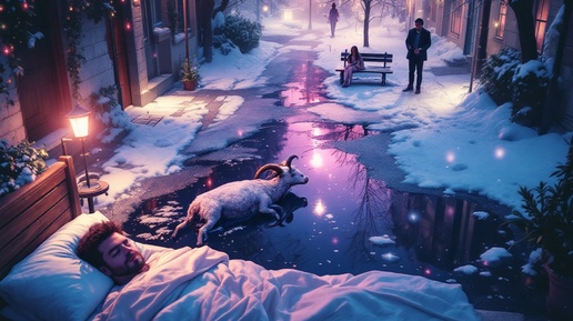Мне приснилось, что я с очень известным человеком — певцом, актером и продюсером — сидел на лавочке и по-дружески разговаривал. Затем мы оказались в комнате, похожей на вагончик. Он лежал и дремал, а я смотрел в окно. На улице была весна, солнечная погода, снег таял. Вдруг по большой луже со льдом поплыл убитый баран. Когда он добрался до берега, то вскочил, начал бегать и говорить человеческим голосом. У него была рана в боку, но он ожил и бодро бегал. Я окликнул известного человека, чтобы рассказать ему об этом, но он уже сидел с девушкой, и я решил выйти...