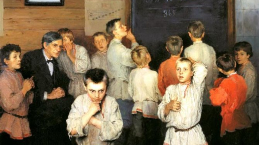 На картине Н. П. Богданова-Бельского (1895 г.) изображён эпизод урока в сельской школе. Дети решают пример, написанный на доске. "Попробуйте" помочь им.