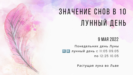 🌓 9 мая 2022 Понедельник день Луны 1️⃣0️⃣ лунный день c 11:05 09.05 по 12:25 10.05 Растущая луна во Льве Сны следующей ночи могут принести приятные переживания, поэтому ложись спать пораньше. Десятые лунные сутки, как известно, связаны с родом и семьей, и сон также отражает этот принцип. Поэтому во сне ты можешь увидеть родственников или супруга (супругу), детей, и даже прародителей всего рода, в том числе и духовных. Если во сне тебе явились сильные рода, или Дух-Хранитель рода будь внимательны...