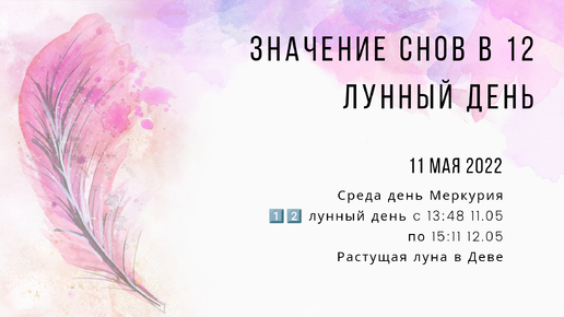 11 мая 2022 Среда день Меркурия 1️⃣2️⃣ лунный день c 13:48 11.05 по 15:11 12.05 Растущая луна в Деве ✨ Если хочешь больше узнать о снах и впустить трансформации в свою жизнь, то подписывайся на канал,💥 ставь лайк👍 и в комментариях пиши, что тебе снилось сегодня! ☁️ Сны в эти сутки могут показать, каким ценностям ты придаёшь большее значение в жизни. Благоприятными будут сны о духовных ценностях, даже если сновидение будет тревожным. Это значит, что ты борешься с желанием провалиться в материальный мир, забыв о важном...