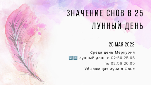 25 мая 2022 Среда день Меркурия 2️⃣5️⃣ лунный день c 02:50 25.05 по 02:56 26.05 Убывающая луна в Овне По возможности проведи эти сутки в покое и уюте, ведь если зона комфорта, то непременно пять звёзд. Как и положено на закате месяца, взращивай умиротворение в себе и окружающих и никуда не торопись. Считается, что сегодня день вещих снов. Важно в этот день при интерпретации снов применять интуицию. Хотя образы бывают очень четкие, все же слушай свой внутренний голос - порой то, что ты видишь, совсем не то, чем кажется...