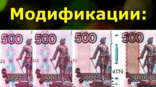 Первый вид - это вариант образца 1997 года. В дальнейшем, для повышения их защитных свойств, были произведены модификации, а именно: в 2001 и в 2004 году. А вот последние изменения этих купюр были в 2010 году. Появился четвёртый вид 500-рублёвых банкнот модификации 2010 года...