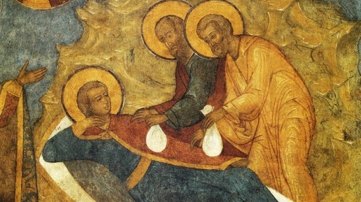 Сон царевича Петра Ордынского. Фреска. Архангельский собор Московского кремля, 1666 г. Сюжет восходит к Повести о Петре, царевиче Ордынском. Царевичу во сне являются апостолы Петр и Павел и дают мешочки с золотыми и серебряными монетами на возведение Петровского монастыря в Ростове...