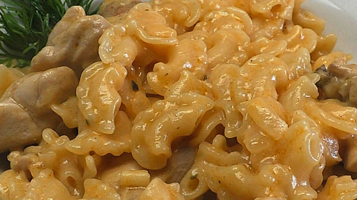 Макароны с курицей в соусе.
