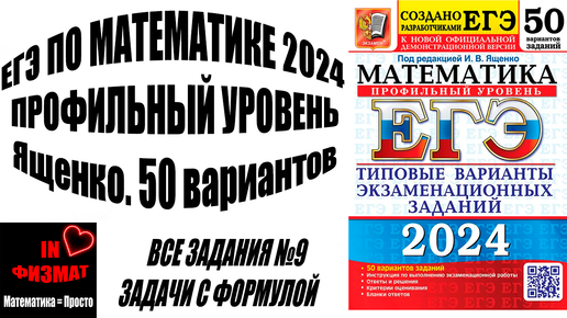 In ФИЗМАТ2178 читали · 2 года назадПодписатьсяВсе задачи с данной формулой в №9 ЕГЭ по математике 2024 (профильный уровень) Ященко. 50 вариантов.