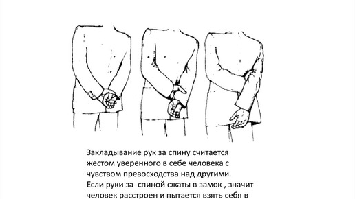 Закрывает тройку лидеров наиболее часто встречающихся при общении в повседневной жизни жестов "скрещенные руки за спиной" В этом жесте встречаются два варианта невербального поведения человека, его внутреннего состояния, наиболее часто встречающийся это первая модель поведения, а именно - уверенность и властность, человек открыто стоит развернувшись лицом к вам, открыл шею, грудь, пах, не выстраивая никаких барьеров при помощи рук, в таком случае этот жест означает: