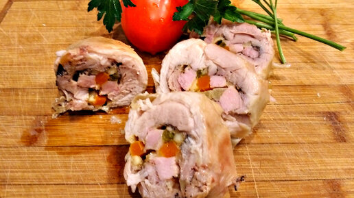 Блюдо это можно подать горячим, а можно, в качестве холодной закуски. Окорочка мы филировали - отделили от косточки, но оставили на коже. Она нам будет служит оболочкой. Теперь нам потребуется кухонный молоток, нитки - 4 длины по 70 см. Иголка обычная швейная, достаточно крупная, с широким ушком. Разложим окорочка кожей вверх и отобьем слегка. Переворачиваем куски. Солим и перчим. Можно добавить пряности, кроме перца. По желанию. Мускатный орех и имбирь молотые. Каждый окорочок у меня вышел около 250 гр...