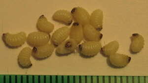 Личинка репейной моли Личинки репейной моли живут в репейнике. В литературе обычно указывается, что их длина составляет 1,5—2 мм. На практике, мне никогда не встречались личинки длиной менее 2-х миллиметров. Тело личинки имеет белый или слегка желтоватый цвет, головка – коричневый. Добывают личинок зимой, собирая высохшие плоды репейника (репьи), пока не наберется приличный ком. Поскольку доставать личинок на морозе крайне неудобно, плоды репейника обычно переносят в теплое помещение и раскладывают на столе, застеленном бумагой или газетой...