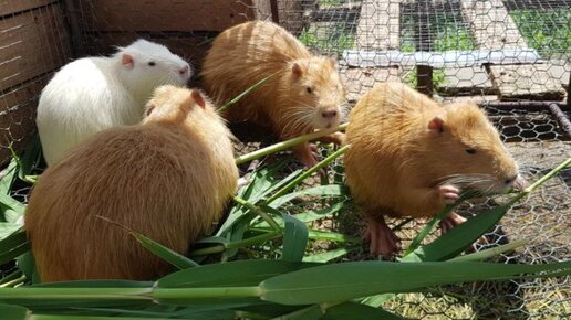 Нутрии. Очень милые зверьки и если бы они не были так милы я бы разводила их на мясо. Но увы и ах! Муж не станет такую красоту убивать, а для меня и забой кроликов проходил тягостно. А это, это не кролики, это нечто большее, эти зверьки очень разумные, живучие и выносливые животные, взрослые особи достигают 12 кг. Их разводят с различными целями: для мяса, меха,жира и даже как домашнее животное. Нутрии легко приручаются и даже откликаются на свою кличку. Знаю вы сейчас скажите, но вы же держите КРС и они то же в какой то степени разумные животные...