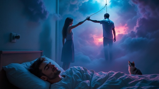Я нахожусь в своей комнате с девушкой. Мы пили воду из-под крана, и вдруг я начал цепляться за оголенный провод от розетки. Девушка помогала мне, но пару раз меня ударило током. Затем мы легли в кровать, и кошка прибежала. Девушка лежит на диване и пытается уснуть, а меня снова притягивает электрическая сила к розетке. Я изо всех сил пытаюсь разбудить её, но меня опять ударило током. Я оказался на полу, пытался крикнуть и привлечь её внимание. В конце концов, мы встали и решили покурить. По дороге в коридоре, которого нет в нашем доме, я обернулся и увидел несколько копий себя в комнате...