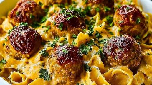 Сочные фрикадельки, широкие ленты макарон и сливочный соус объединяются в настоящее блюдо для домашнего уюта всей семье. Легко готовить и очень вкусно - запеканка, которая точно понравится всем!