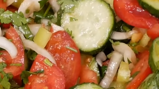 Всем приветик! Для приготовления салата можно использовать любую зелень: петрушку, кинзу, укроп, базилик. Кто предпочитает салатик поострее, то можно добавить острый перец 1 шт. Ингредиенты: Приготовление: Помидоры моем, вырезаем плодоножку, режем на небольшие кусочки. Выкладываем в кастрюлю. Огурцы моем, отрезаем кончики с обеих сторон, режем кружочками. Выкладываем в кастрюлю к помидорам. Сладкий перец моем, чистим от семян и нарезаем соломкой. Лук чистим, моем, нарезаем полукольцами. Чеснок чистим и мелко нарезаем...