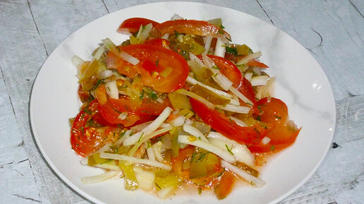 Салат «Демисезонье» из свежих помидор и соленых огурцов
