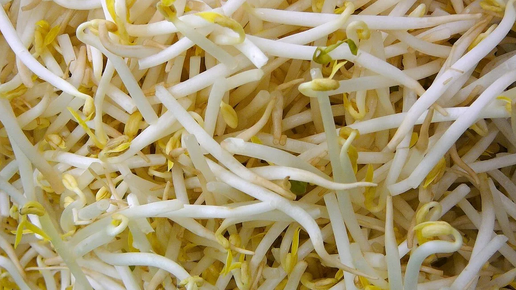 Никогда раньше мы не пробовали ростки фасоли, даже с неким подозрением поглядывали на них на витрине. Потом в кафе я попробовала вьетнамский суп фо-бо, в него как раз добавляют эти самые ростки и мы решились их купить. Оказалось, что они очень даже сочные и вкусные, даже в самостоятельном виде)) Похожи по вкусу на зеленый горошек с грядки) Сначала я добавила их в питательный салат. В его состав я включаю листья салата (или обычную капусту), свежую тертую морковь, сельдерей, можно добавить морковь по-корейски, ну и ростки фасоли...