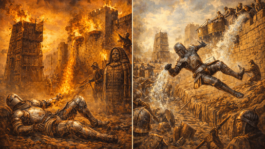 Рыцарь в сияющих доспехах падает с коня и беспомощно барахтается на земле, как перевёрнутая черепаха. Его товарищи пытаются поднять — тщетно, слишком тяжёл. Защитники замка опрокидывают на штурмующих котлы с кипящим маслом. Осадная башня подкатывает к стене, мост опускается, и воины врываются на валы. Катапульта делает выстрел — и стена рассыпается, как карточный домик. В подземелье пленника запирают в железную деву, и шипы медленно впиваются в тело. Всё это выглядит эффектно. И всё это — выдумка Голливуда...