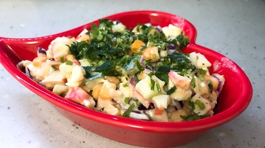 Всем привет! Был я как-то с женой в очень уютном ресторанчике и заказал с виду, казалось бы, обычный салат, но на вкус он был замечателен, поэтому я попросил хозяина полный рецепт и сейчас поделюсь им с Вами. Этот салат отлично подойдёт на любой праздничный стол, ведь он очень свежий и лёгкий, не смотря на то, что в составе есть майонез. Погнали готовить! Для начала, в миску нам надо порезать на кубики крабовое мясо, к нему добавить кукурузу. Затем режем мелко одну небольшую луковицу, желательно взять красный лук, а не обычный, он придаст интересный вид салату, будет сочно и ярко😊...