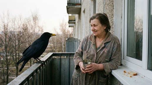 Ворона не прилетела. Зоя Фёдоровна стояла на балконе третье утро подряд, держа в руках жестяную банку с хлебными крошками и варёным яйцом. Апрельский ветер забирался под халат, но она не уходила. Ждала. Шесть лет – каждый день, в половине восьмого – на перила садилась ворона. Крупная, с жёлтым клювом, треснувшим посередине. Зоя узнавала её среди других птиц безошибочно. Эта была её. Она высыпала корм на широкий подоконник. Отошла к стене, чтобы не пугать. Ворона никогда не боялась, но Зоя всё равно отходила – так было правильно...