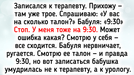 Посещение поликлиники редко проходит без приключений: отстоять свое место в живой очереди или найти потерянную регистратурой карточку стоит десятка-другого нервных клеток. Но иногда в медучреждениях случаются и курьезные ситуации, которые даже поднимают настроение. Одно можно сказать точно: без новых впечатлений отсюда мало кто уходит. Была травма колена, ходила с костылем. Поехала в травмпункт. Возле кабинета врача очередь человек из 20, стулья все заняты, стою на одной ноге. Врач вышел, глянул на меня и говорит: «Проходи»...