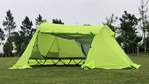 Многие не хотят ночевать в палатках из-за того, что "спишь на земле": жестко, холодно, ну и непривычно. Тут бы поставить современную раскладушку и решить эту проблему. Но вот беда - в палатки, например даже в трехместные, раскладушка не влезает :( Казалось бы проблема. Но она легко решается если совместить раскладушку с самой палаткой. По такому пути пошли китайские товарищи выпустив модель Mimir LD01 Палатка выпускается в двух цветах - в камуфляжном и зеленом. Впрочем цвет различается только у тента, внутренняя палатка одинаковая в обоих моделях...